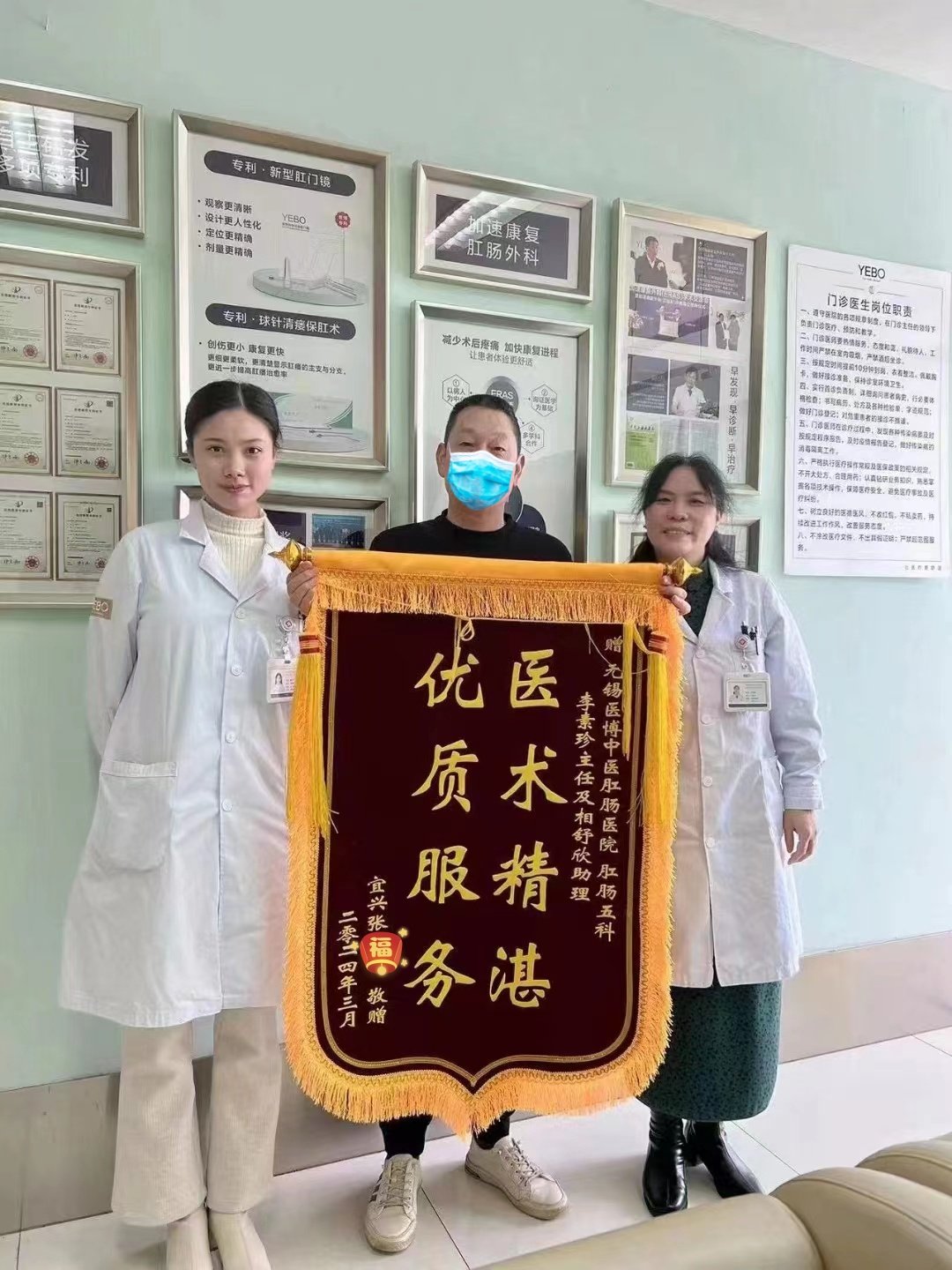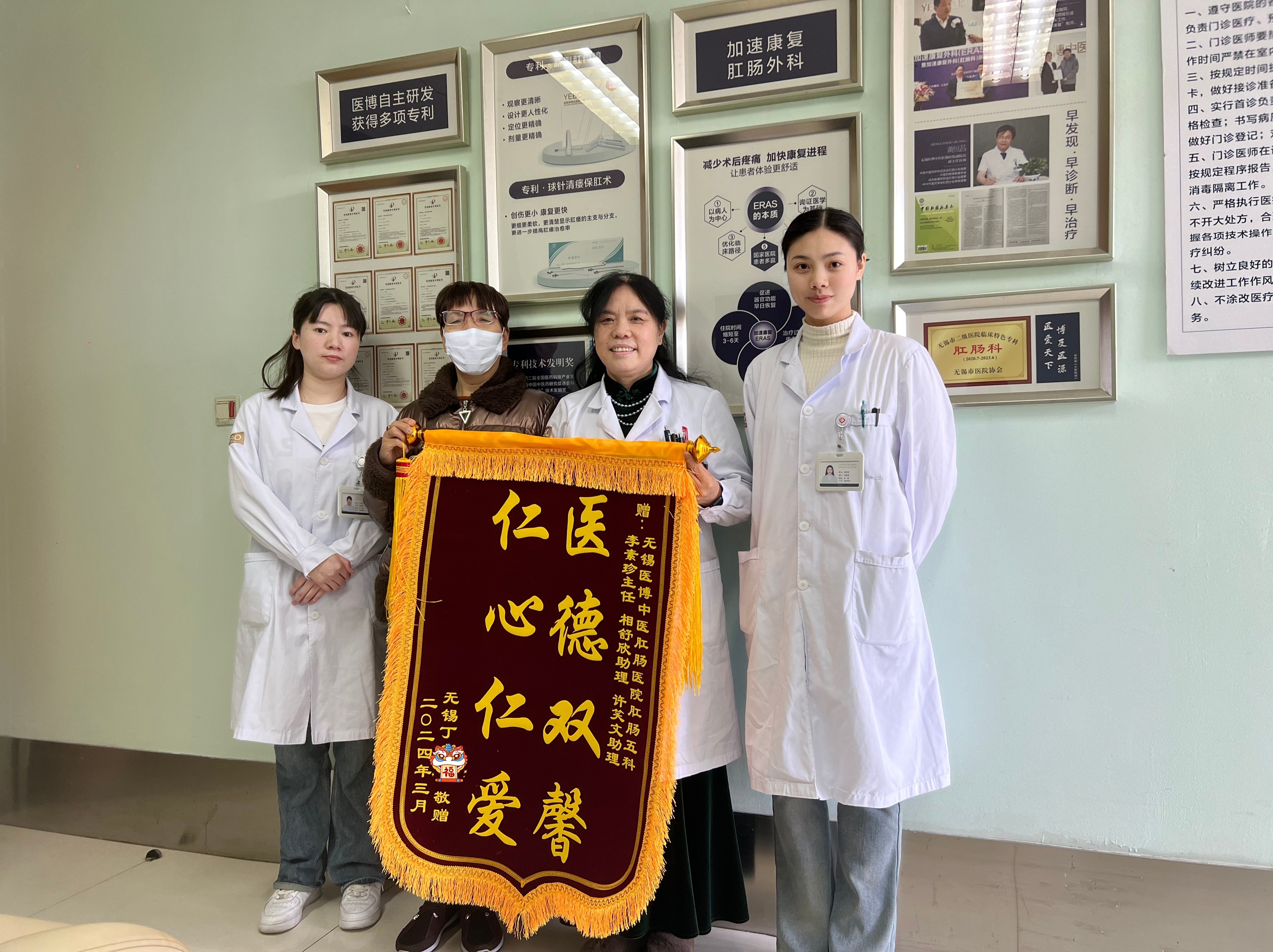 来自无锡宜兴的张先生,也在我院找到了健康的希望。他将一面写有“医术精湛,优质服务”的锦旗赠予了李素珍主任及助理。张先生的这份认可,是对我院医疗服务的直接肯定,也是对我们团队协作精神的赞赏。我们知道,每一次成功的治疗背后,都是医护人员无数个日夜的努力和付出。这面锦旗,是对这些默默付出的最大回报。